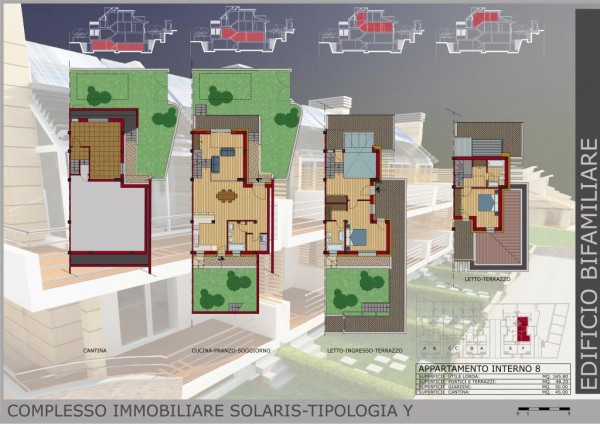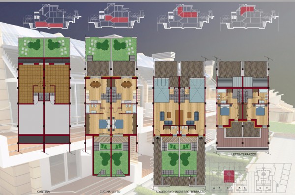 Le costruzioni sono disposte su 3 piani e hanno la seguente composizione tipo: